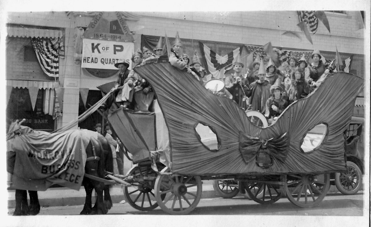 A float on Monrovia's 28th Birthday May 16, 1914, on Myrtle Ave in front of K of P Headquarters. Savings Bank at left. The sign above KofP says "Golden Anniversary," but that is apparently referring to the 50th anniversary of the K of P organization. From the Steve Baker collection. See full details here.