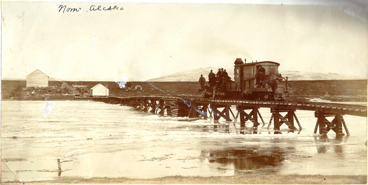 In addition to being the main founder of Monrovia, William N. Monroe, along with George Monroe, also built a railroad in Nome, Alaska. This photo was kept by George's wife (Annetta Evans) in her scrapbook, so it may be the line they were building, the Wild Goose Railroad, from Nome to Anvil. (Apparently Anvil Creek, a gold mining spot near Nome.) A ticket (not shown here, says "Passengers assume all risk on freight trains." From the Steve Baker collection. See full details here.