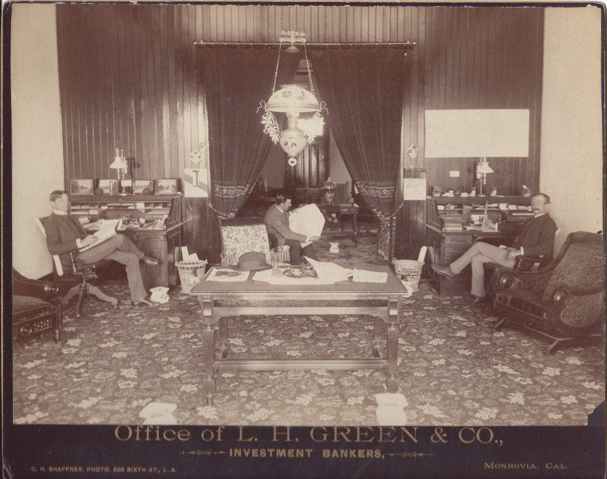 Office of L.H. Green & Co. - Investment Bankers, Monrovia, around 1887. Mr. Green to the right. Unknown young man at left side of desk. Mrs. Hotchkiss said he was accidently killed while hunting; the gun on the buggy seat exploded. The inner room where ladies who were thought to be more gentle could conduct business. Green & Co.'s office was on the east side of Ivy Avenue across the street from the Grand View Hotel. The building was originally opposite the Grand View Hotel and later moved to the 500 block of S Myrtle Ave From the Myron Hotchkiss collection. See full details here.