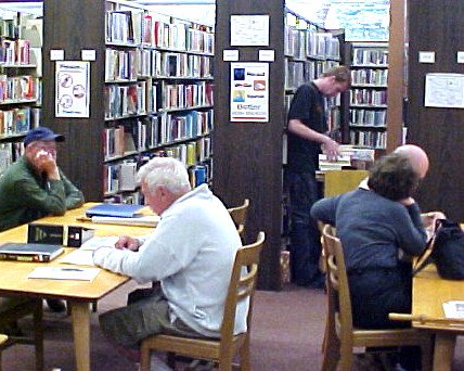 Patrons use the outdated and crowded 1950s-era library in Library Park prior to its replacement with a new, larger and modern facility in 2009. [I liked that old Library - Brad]