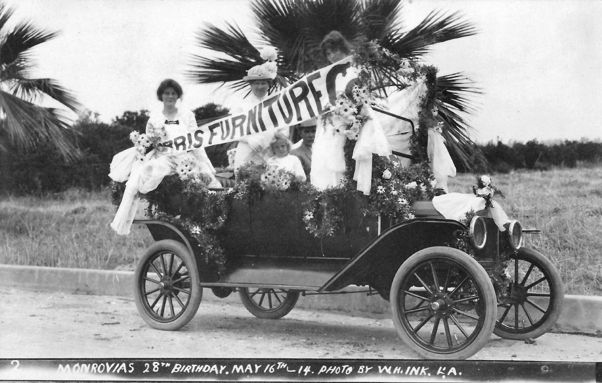 The Morris Furniture entry in the 1914 Monrovia Days Parade, celebrating Monrovia's 28th birthday.
