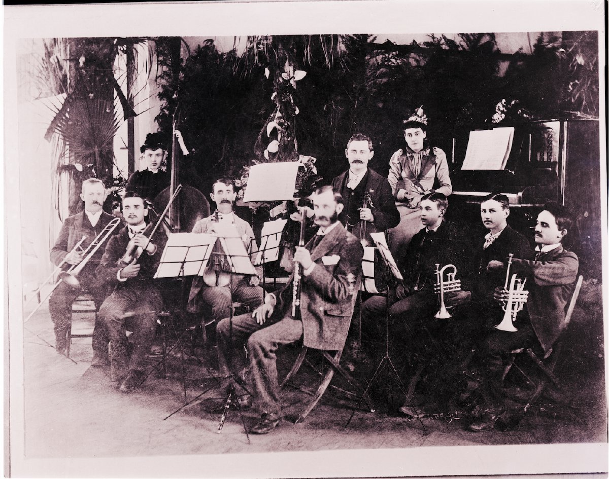 Monrovia's Symphony Orchestra about 1900. Monrovia Messenger, Feb. 10, 1893, writes: A Fine Orchestra. In its report of its recent Entertainment at Sierra Madre the VISTA says: "The Music by the Monrovia orchestra was unusually fine. They have an organization superior to many in larger towns. Prof. Cronewett and his violin and Prof. Strite with cornet were 'A1'. Mr. Reichard also showed a good baritone. Mrs. Parker, double bass and Miss Bowerman at the piano. The other performers were F.G. Seger, 2nd violin; Chris. Elbing, 3rd violin; C.W. Shook, French horn. A fine orchestra." From the Myron Hotchkiss collection. See full details here.