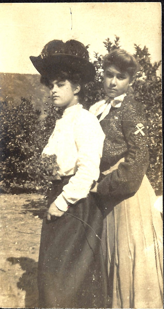 Monrovia ladies Agnes Sutton and May Baker in 1904. Photo by May Baker, an avid photographer. I wonder if that's the trigger to the camera she's holding in her hand. From the Steve Baker collection. See full details here.