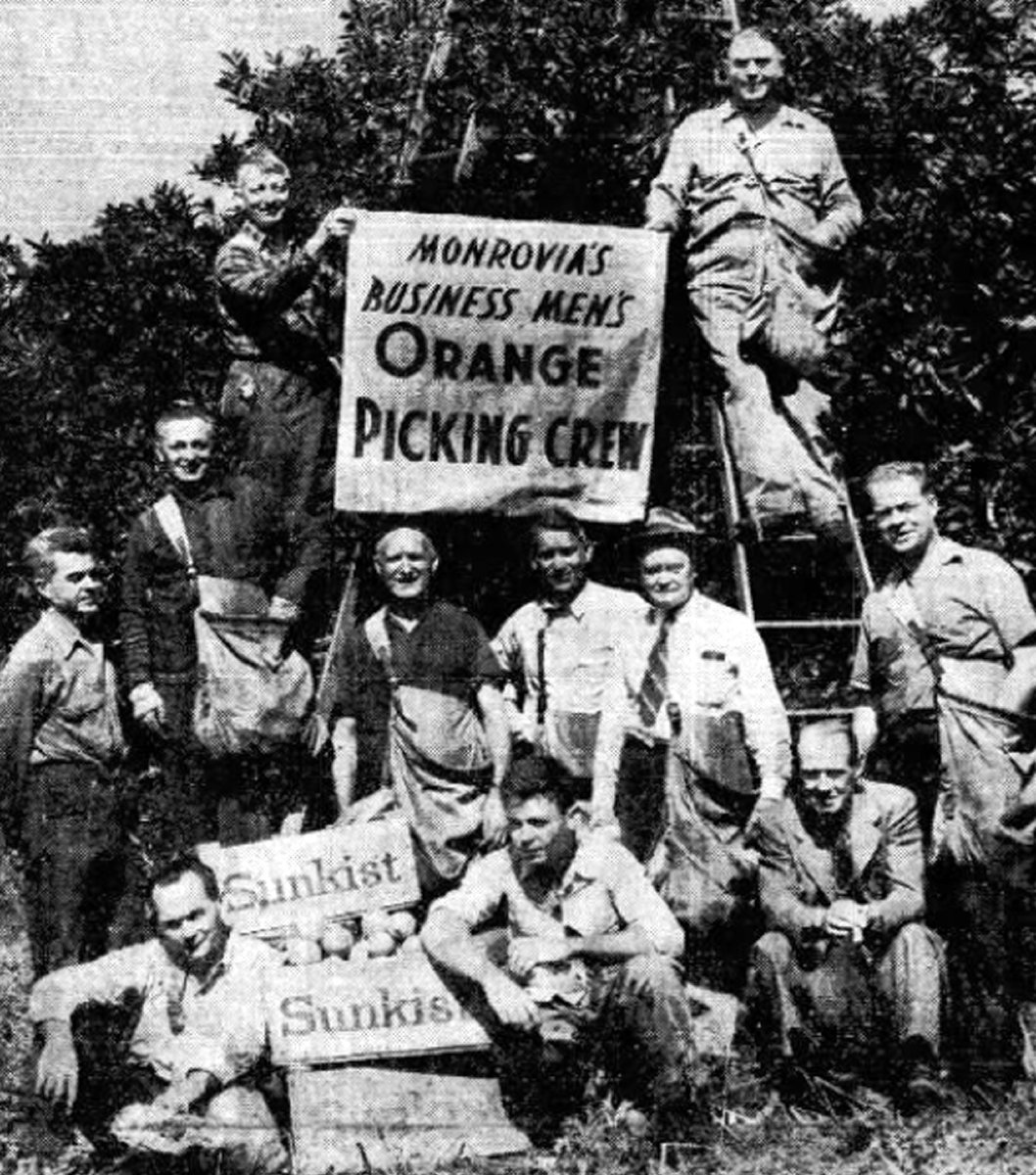 Monrovia's merchants and professionals came to the aid of local orange growers during a harvesting manpower shortage in 1943, at the height of World War II. Top, on ladders, Everett J. Simonds, YMCA secretary, left, and Charles S. Dandridge, banker. Middle row, from left, Pro Elliott, grove owner; Jack Zelkowitz, shoe store owner; Alexander. R. Currie, retired produce executive; Stanley C. McClintic, Monrovia-Arcadia-Duarte (MAD) High vice principal; O. B. Hart, retired gold dredger; and the Rev. Haven Davis, minister. Bottom row, from left, Charles A. Wiley, cleaner; Ted McBratney, Old Town merchant; and Ed Hart, exchange manager. From the Dick Singer collection. See full details here.