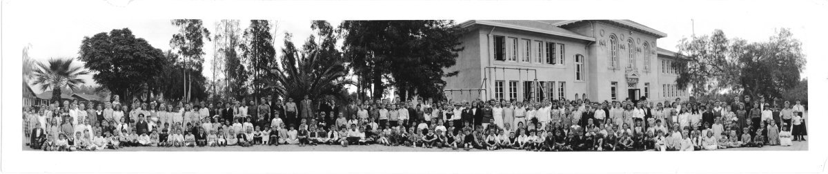 Click to enlarge photo. Here are the children and teachers at the First Wildrose School, at the same location as the current school, 232 Jasmine Avenue. This school was built in 1912. From the Myron Hotchkiss collection. See full details here.