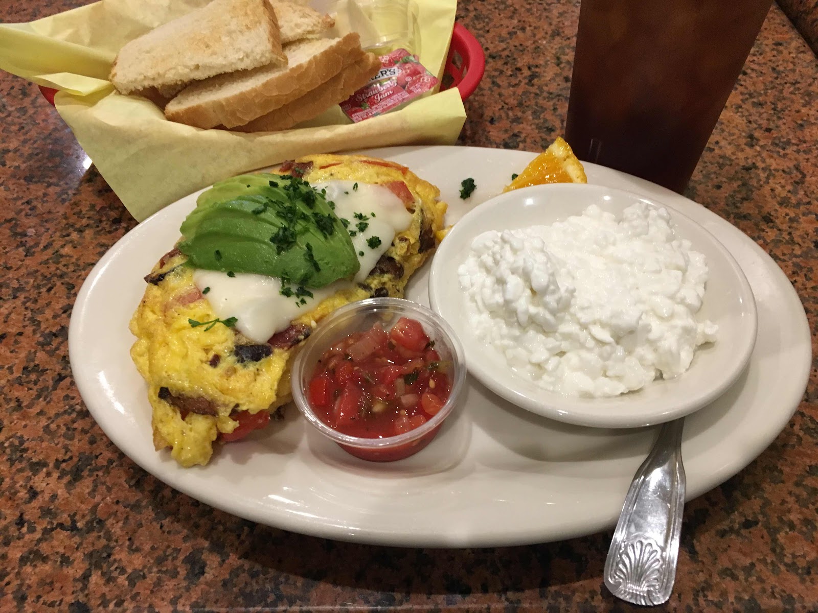 Lunch at Sunday’s Old Town Bistro, on the east side of Myrtle about a half block north of Colorado. Even though it was lunch I ordered a California Omelet, for $13.99 and an iced tea for $2.75. Quick and pleasant service, and decent food.