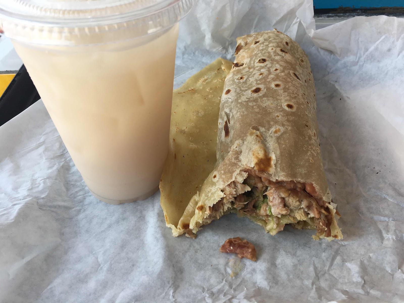 Lunch at Los Victor’s, the Mexican food stand at Foothill and May. Got the carnitas burrito for $6.50 (took a bite so you can see inside) and a medium horchata for $1.90. Both the burrito and the horchata were excellent!