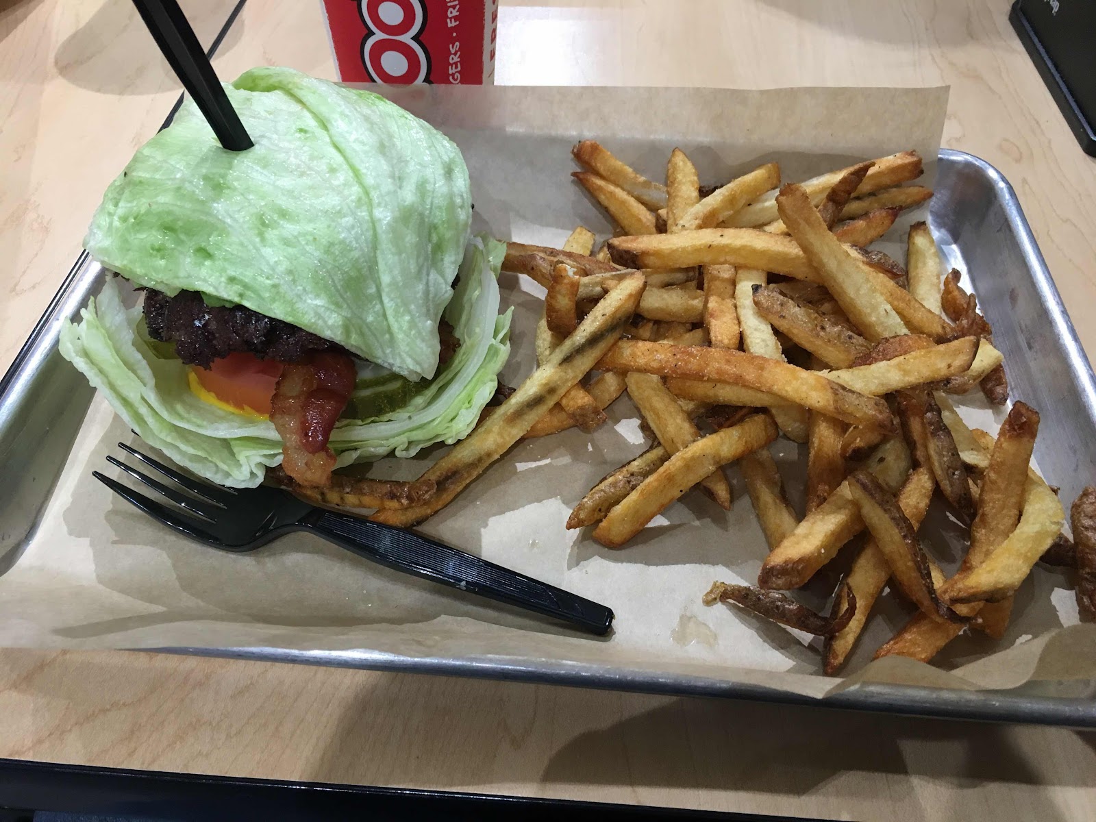 Dinner at Mooyah Burger recently. Got The Paleo burger- lettuce instead of a bun, two patties of beef, bacon and avocado - for $10.57, fries for $3.29, and an iced tea for $2.49. (Those are the regular prices; I had a coupon.) The lettuce bun was different but good. Nice meal.