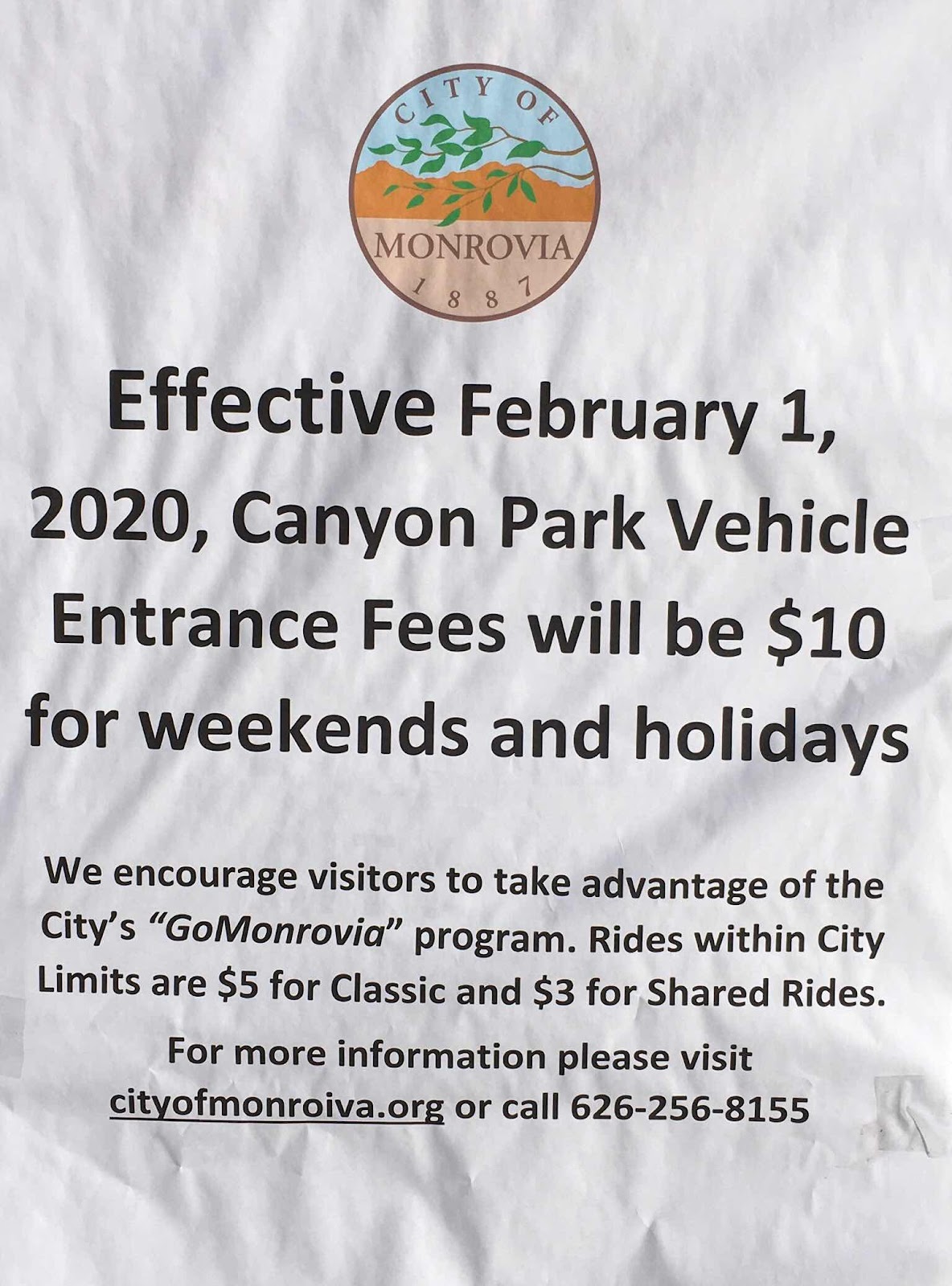 Beginning Feb. 1 the parking fee for Monrovia Canyon Park will jump from $6 to $10 for weekends and holidays.