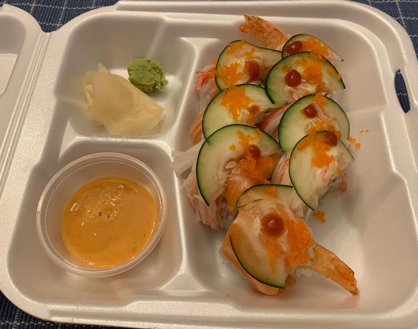Got dinner tonight from Hon Sushi, on the north side of the Vons parking lot at the corner of Foothill and Myrtle. Got the Monrovia Roll (how could I resist) with tempura shrimp, crab meat, avocado, salmon and cucumber and stuff for $13.95. It was very tasty.