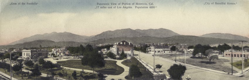 Here is a Happy New Year card from 1900 with a "birdseye view of Monrovia from the north." The house in foreground is 225 W. Hilcrest, which was torn down by the mid 1930's. From the Myron Hotchkiss collection. See full details here.